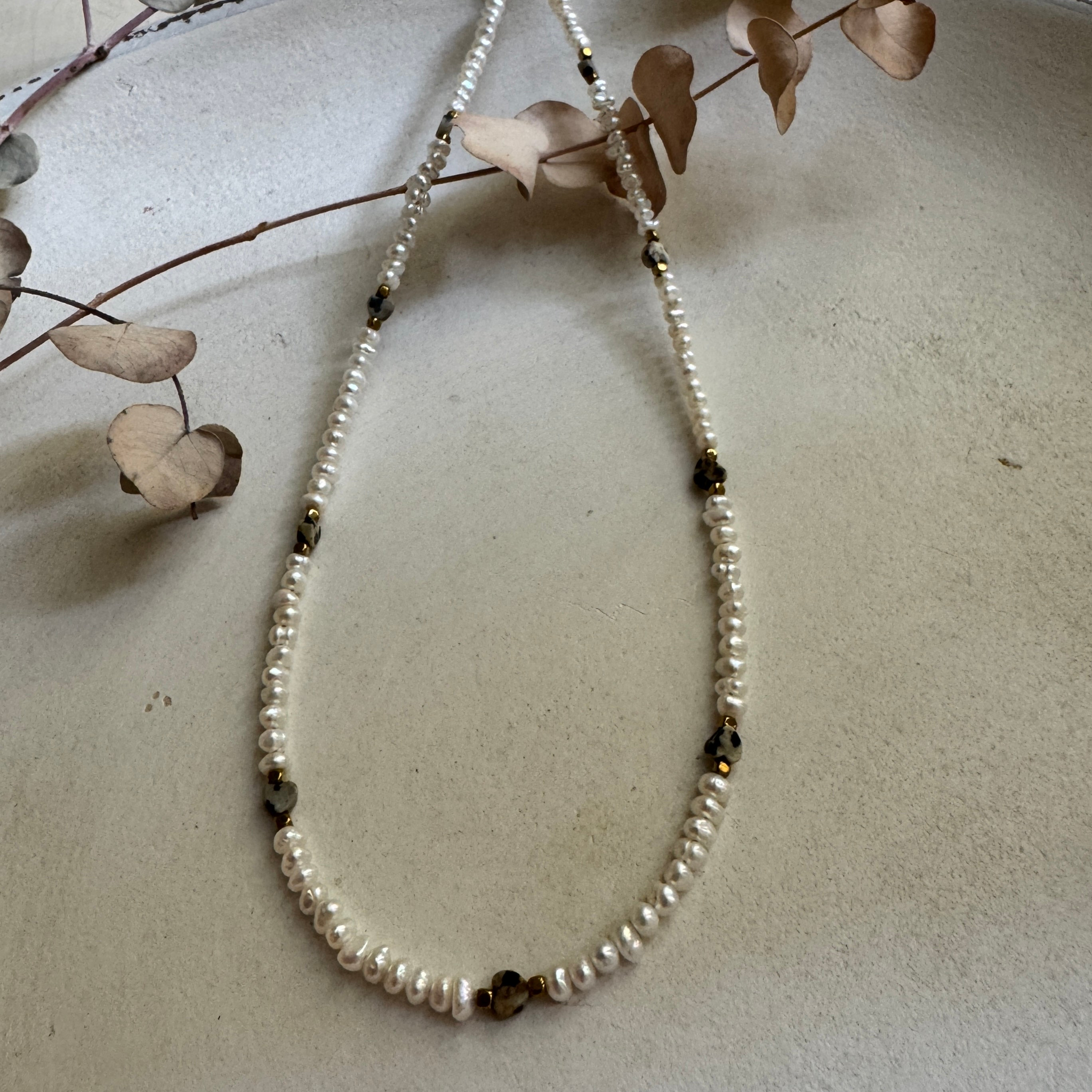 Collana girocollo con perline di fiume irregolari e cuoricini in diaspro dalmata.