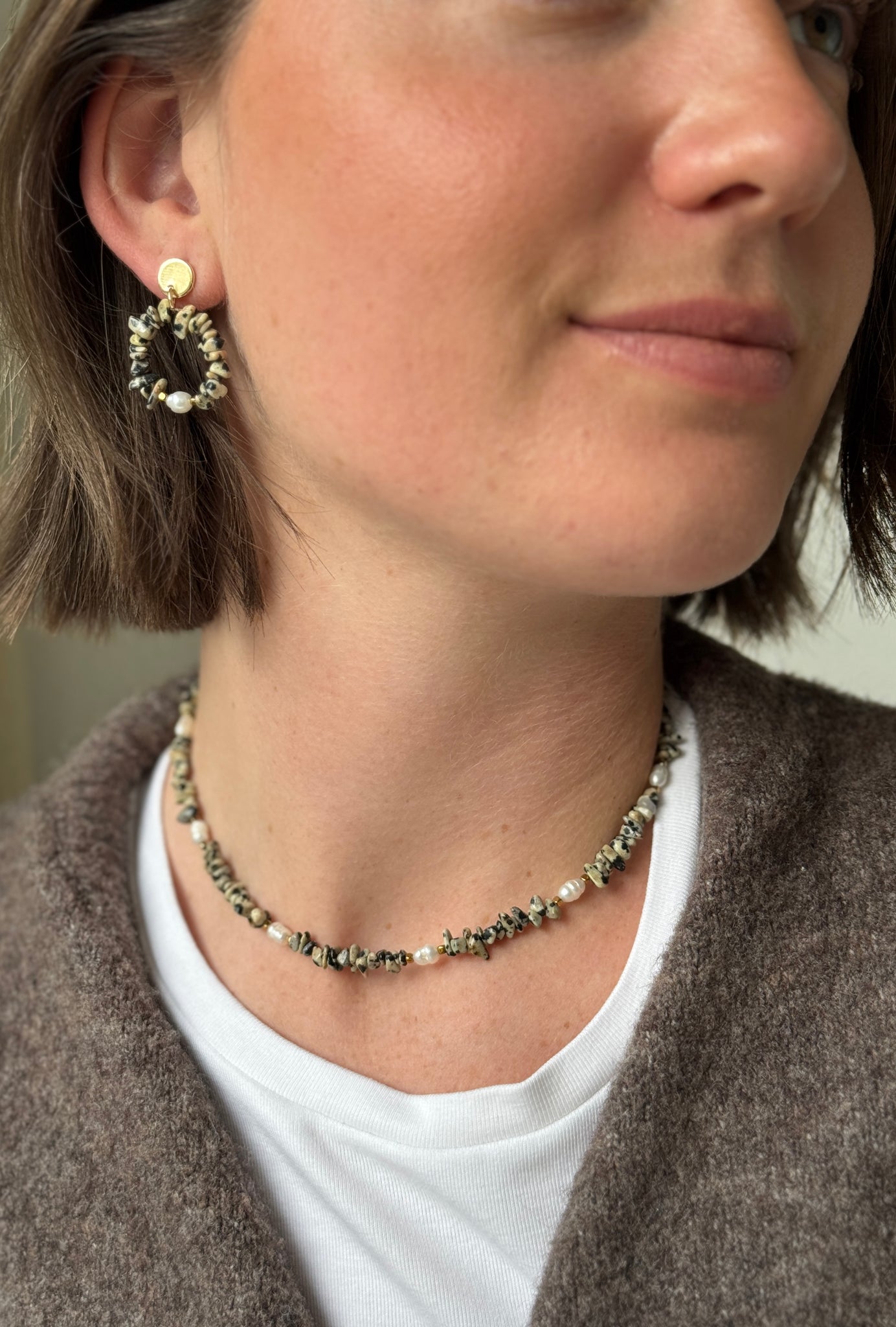 Collana girocollo con Chips di diaspro dalmata, cubetti in ematite dorata e perle di fiume ovali.