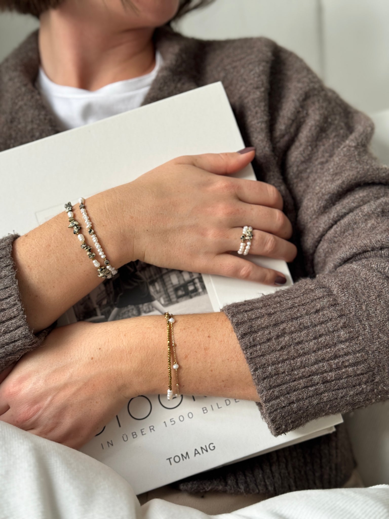 Anello con perline di fiume irregolari e cuoricini in diaspro dalmata.