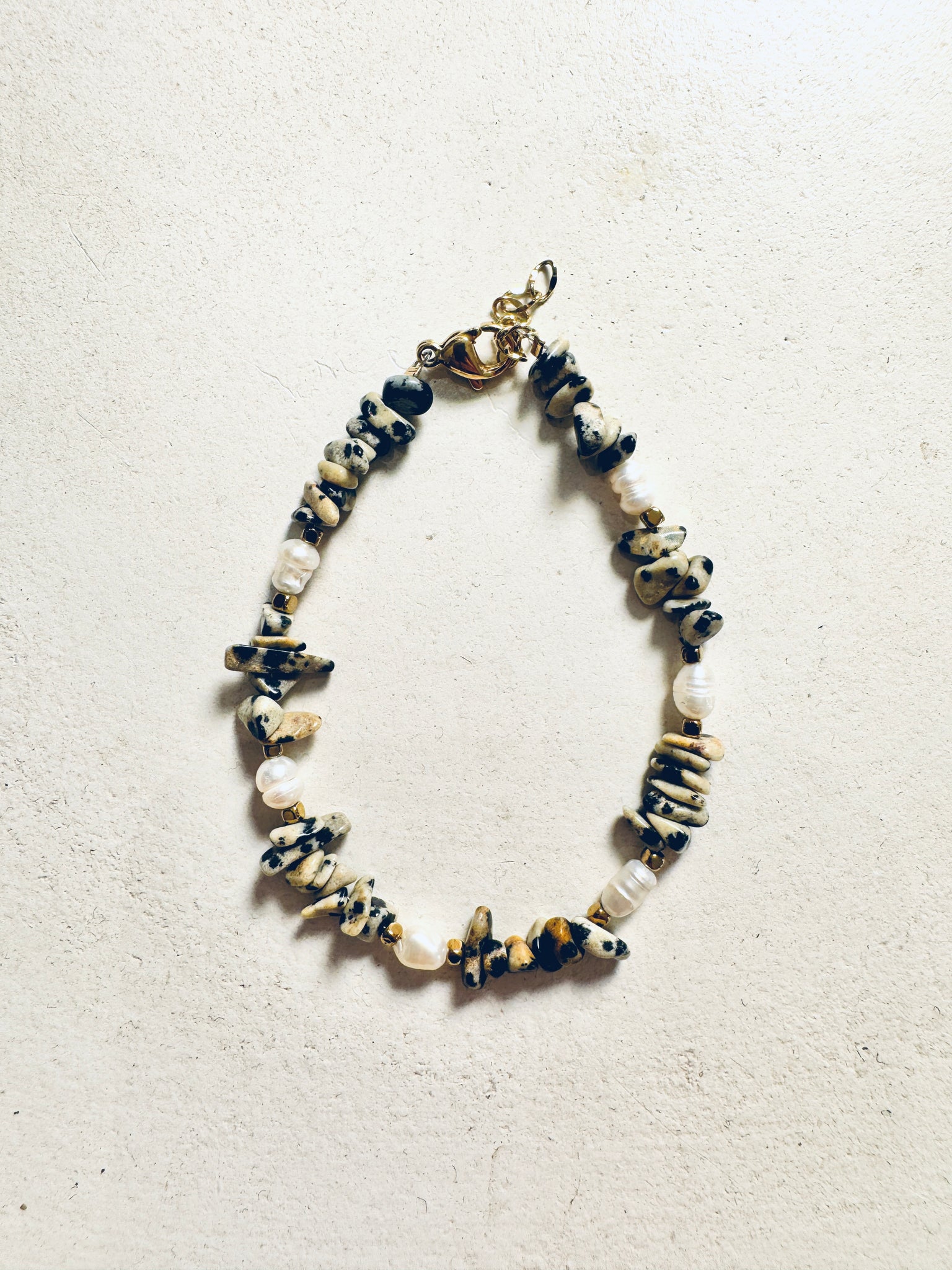 bRacciale girocollo con Chips di diaspro dalmata, cubetti in ematite dorata e perle di fiume ovali.