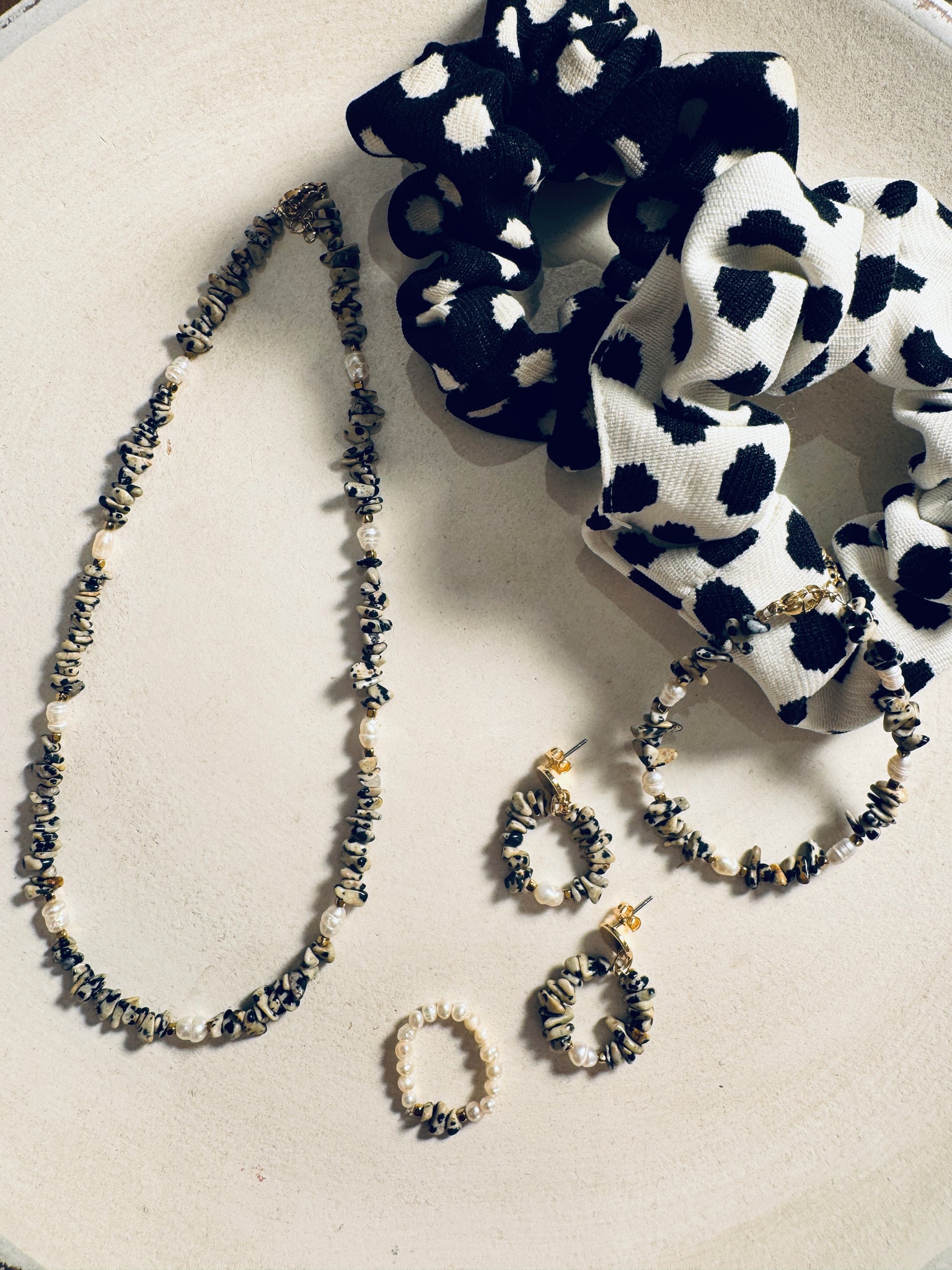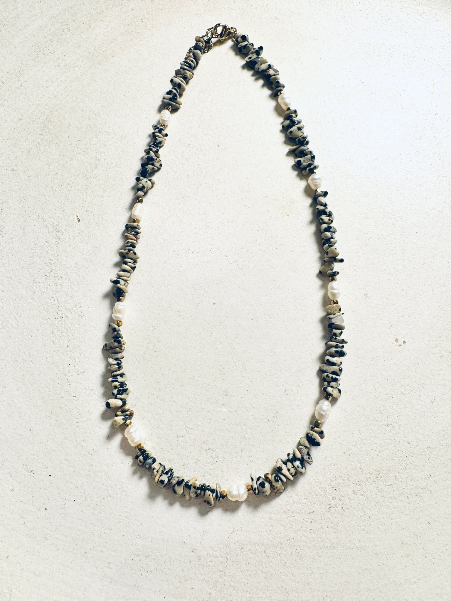 Collana girocollo con Chips di diaspro dalmata, cubetti in ematite dorata e perle di fiume ovali.